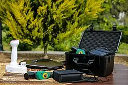 Mostaan 110 is a series of smaller devices, though the main device appears to be a wired handheld device slightly resembling a power drill, featuring a long forward-facing metal antenna mounted to the top.[1] According to the IRGC, the device detects COVID-19 using electromagnetic radiation emitted by the antenna.[1][2] The device is connected to a handheld dish-like device, apparently used to scan people.[4]