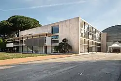 The building, together with the Latin America pavilion, forms the head of the Fountain of the Esedra. This constraint strongly conditioned Carlo Cocchia to design the building in 1938 according to an asymmetrical T-shaped scheme characterized by the unusual functional coupling of an Olympic-size swimming pool with diving board in the stem of the T and the restaurant room at the head. The connection to the various floors is guaranteed by an architectural promenade of clear Lecorbusieran ancestry. In the 1952 restoration, carried out by Cocchia himself, the ramp was reconfigured by knocking down the roof slab and opening the lateral infills of the loggia on the main façade. Currently the building has been recovered by Massimo Pica Ciamarra who has recovered the original forms of the work and has adapted the entire building to the new requests by also adding an underground pool below the original one. The interiors are characterized by the three-tiered division of the dining room which allows spectators, guests of the restaurant, to easily observe the 180-degree view of the swimming pool, the Flegrea Arena and the Esedra Fountain. The floor is decorated with Neapolitan majolica with references to Mediterranean cuisine.[6]