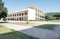 Designed in 1938 by architects Gherardo Bosio and Nicolò Berardi, it is characterized by an architecture that is inspired by the Albanian fortress house. The façade, now tampered with, was conceived as a two-dimensional ashlar front that frames the insertion of the central pillared element on three levels that houses the loggia and the front portch. The pavilion was recovered in 1952 with the interior design by Luigi Cosenza. It is currently in disuse and is attacked by vegetation that has grown wild enough to prevent access and has favored an acceleration of the degradation of the pavilion.[12]