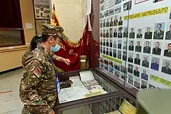 Its location on a hill overlooking Yerevan makes it look like a guardian of the Armenian capital. Every year on 9 May, thousands of Armenians visit the statue of Mother Armenia and lay flowers to commemorate the Armenian martyrs of the Second World War. The pedestal hosts the Mother Armenia Military Museum of the Ministry of Defense. When first built it housed a military museum dedicated to World War II. Today, a large proportion of the exhibition space is devoted to the Nagorno-Karabakh War of 1988–1994. On display are the personal belongings, weapons, and documents of participants, and the walls are decorated with their portraits. Among other historical artifacts, there is a map on which Armenian forces worked out their campaign for the Battle of Shushi.