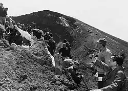 Toho had deemed Mothra's attack on New Kirk City too expensive and advised Honda and Sekizawa to write a more budget friendly climax. The new ending had Nelson and his crew take Shinji hostage near a volcano, which Nelson falls into after Mothra flaps her wings. Toho's contract with Columbia Pictures stipulated that the climax needed to take place in an American-style city. Toho sent a letter to Columbia Pictures requesting approval to change the climax but rather than wait for a reply, Toho instructed Honda to proceed with principal photography as planned. The new ending was the first scene to be filmed in Kagoshima Prefecture near Mount Kirishima. However, around the same time, Columbia Pictures denied Toho's request for alterations. Surviving images of the alternate ending appeared in official publicity materials; however, the footage was never developed. While filming the alternate ending, the Nelson dummy used to be plunged into the volcano was later found by locals, who believed it to be a suicide. Authorities retrieved the "body", which led to Honda and his crew to be "roundly scolded".[56][57]