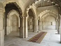 The structure, located in the northwestern corner of Dewan-e-Aam quadrangle, is typical of Mughal architecture of Shah Jahan's times.[7] It is completely built of white marble that was brought from Makrana.[4] The façade is composed of cusped arches and engaged baluster columns with smooth and fine contours.[8] The mosque has three superimposed domes, two aisles of five bays, and a slightly raised central pishtaq, or portal with a rectangular frame.[9] This five-arched facade distinguishes it from other mosques of the similar class with three-arched facades. The interior is simple and plain with the exception of ceilings that are decorated and designed in four different orders, two arcuate, and two trabeated.[10]