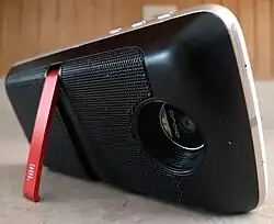 The Moto Z features an accessory system known as "Moto Mods". Mods are case-like accessories that are attached to the rear of the Moto Z via a series of magnets. Using the pogo pin connectors, Mods can communicate with the device to provide additional functionality. Mods are hot swappable, and are automatically detected by the operating system software once installed.[7][8] During the launch event, Lenovo unveiled several mods to be available on launch, including battery packs, the "SoundBoost" (which features a JBL speaker and a kickstand), and a pico projector ("Insta-Share"). All Moto Z devices ship with a "Style Shell"—a basic rear cover, as well as a clear, plastic "bumper" case that protects the bezel of the device.[7][8][11]