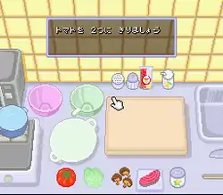 Name brand products from Japanese supermarkets are used as an advertising gimmick from the company Ajinomoto. A young girl named Motoko takes children through a fantasy world and provides educational and informative content about the history of mayonnaise and other things that are related to food history.[4] Games include reversi against a witch and finding seven dwarves that turn into sausages. The gameplay is somewhat similar to the more widely known Nintendo DS title Cooking Mama, which was released more than a decade later in 2006.