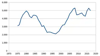 | 2000 | 2,897 | 58,000[3] | 4.3 million[2] |