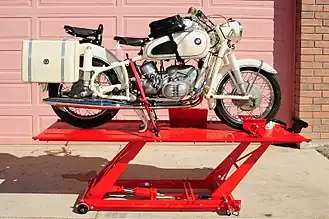 A motorcycle lift is a lift table that is designed to handle motorcycles. Many repair shops use such lifts to bring the vehicle off of the ground and up to a level so that the mechanic does not have to put any strain on his or her back or lay upon the ground to perform any kind of work upon the vehicle. Also, motorcycle enthusiasts have put these lifts into their home garages so that they can perform simple maintenance jobs such as changing the oil and cleaning the bike without having to get down on the ground. These lifts are typically made of steel and powered by air or hydraulic cylinders that handle load capacities up to 1,500 lb (680 kg).