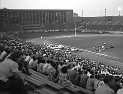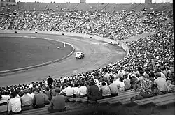 After World War II, the stadium's track became a "hotbed" for midget racing.[6] In 1946, the Chicago Auto Racing Association began hosting regular midget automobile races at the stadium.[6] In 1948, Prince Bertil, Duke of Halland, a member of the Swedish royal family, drove a midget car around the track for fun while in Chicago on an official visit.[23][24] July 23, 1954, the stadium hosted the midget auto racing 100 Lap National Championship. Racers included Tony Bettenhausen, Duke Nalon, Art Cross, Mike Nazurek, Frank Burany, Roy Newman, Gene Hartley, Jimmy Knight, Cal Niday, Johnny Roberts, Jack Bates, among others.[3] A midget racing event the night of July 20, 1957 was one of the earliest at Soldier Field to be televised.[3] On August 14, 1955, the track held a AAA National Midget Car Series race, which was won by Chuck Rodee.[25] On July 23, 1966, Mike McGreevy won the last United States Auto Club midget feature race held at Soldier Field.[6] The final season of midget racing at the stadium, in 1968, saw races hosted by the United Auto Racing Association.[6]