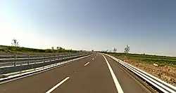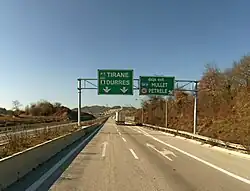 The motorways in Albania (Albanian: Autostrada or Autostradë) are the controlled-access highway system in Albania predominantly under the supervision of the Ministry of Infrastructure and Energy. The motorways are characterised as roads with at least two lanes in each driving direction including an emergency lane and a maximum allowed speed limit of not less than 110 kilometres per hour (68 mph).[1]
