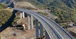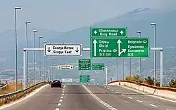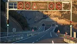 The system has inherited some from the former Yugoslavia, although new sections have been completely built in the recent years. Pay-tolls (Macedonian: patarini) remain in place and the speed limit is 130 km/h (81 mph).[1] The total length of the motorway network as of February 2025 is 317 km,[2] with extra 167 km being under construction. The works on the first couple kilometers of the motorway from Skopje to Kosovo's border started in 2020. The extension of the A2 motorway from Kicevo to Ohrid started in 2014. The part that is supposed to connect Gostivar and Bukojchani, Prilep and Bitola and Trebenishta and Kjafasan started construction by consortium Bechtel & Enka in 2024.[3][4] Furthermore, most stretches of the existing network have been reconstructed, so overall the Macedonian motorways are in decent shape.[5]