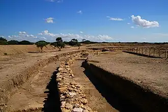 The confined space on which the city was built agrees with the description of Diodorus that the houses were lofty and of solid construction, with narrow streets (στενωποί) between them, which facilitated the desperate defence of the inhabitants.[10] Much of the walls, with those of two gateways, can be seen whose circuit is about 2.5 kilometres (1.6 mi).