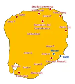 Recent archaeology carrìed out by La Sapienza Universìty in the area of the "Kothon" found the earlìest occupation of the Phoenician settlement dating from the second quarter of the 8th century BC.[26] It started at the anchorage identified on the southern shore of the island, and grew around the nearby springs, where the earliest sacred area was erected (Temple C5). This area initiated rapid growth of the town and houses spread over the acropolis (which had already hosted a huge prehìstoric village). Three main centres soon became established: