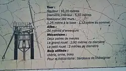 The tower is 1.25 metres (4 ft 1 in) thick at the base and 1.12 metres (3 ft 8 in) thick at the top. It is 10.20 metres (33 ft 6 in) tall and has an internal diameter of 5.10 metres (16 ft 9 in) The Common sails have a span of 24.00 metres (78 ft 9 in). They are carried on a wooden windshaft with a cast iron poll end. The windshaft carries a head wheel of 2.90 metres (9 ft 6 in) diameter and a tail wheel of 2.00 metres (6 ft 7 in) diameter. One of the two pairs of millstones is 2.00 metres (6 ft 7 in) diameter.[2]