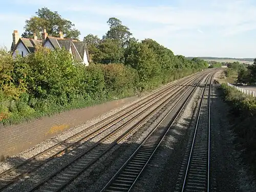 In 1892, during quadrupling of the main line, the junction for Wallingford was resited down the line to the north-west, closer to the point of divergence, and a new station built there.[5] Moulsford station closed on 29 February 1892,[8] being replaced the same day by the new station which was known as Cholsey and Moulsford,[9][10] being significantly closer to Cholsey than to Moulsford. Some of the original station buildings can still be seen at the site of Moulsford railway station.