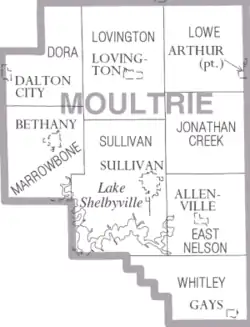 Moultrie County is a county in the U.S. state of Illinois. According to the 2020 United States census, its population was 14,526.[2] Its county seat is Sullivan.[3] The name is pronounced as in "mole tree", unlike the pronunciation of its namesake, the South Carolinian Revolutionary War hero William Moultrie.