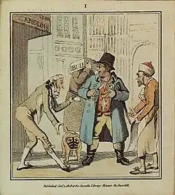 Mounseer Nongtongpaw is based on a popular 1796 song of the same name by the entertainer Charles Dibdin.[5] Dibdin's original song mocks English and French stereotypes in five eight-line stanzas, particularly "John Bull's" refusal to learn French. John Bull makes numerous inquiries to which he always receives the same response: "Monsieur, je vous n'entends pas" ("Monsieur, I don't understand you"), which he mistakenly interprets as "Mounseer Nongtongpaw". He comes to believe that the Palais Royal, Versailles, and a beautiful woman—the sights he sees while touring France—belong to this mysterious personage. When he comes upon a funeral and receives the same response, he concludes that all of Nongtongpaw's wealth could not save him from death.[1] Mounseer Nongtongpaw expands Dibdin's comic verses, adding more events to the narrative in shorter four-line stanzas, such as inquiries about a tavern feast, a shepherd's flock, a coach and four, and a hot-air balloon:[6]