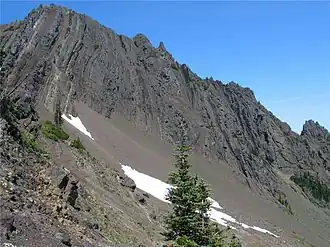 Mount Angeles summit. Notice the steeply tilted layers of ocean floor sediments -