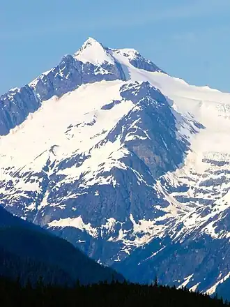 Mount Bagot, also known as Boundary Peak 107,[4] is located in the Boundary Ranges of the Coast Mountains. The true summit is set 200 metres inside Canada and the lower Southwest Peak (7,087+ ft, 2,160+ m) lies directly on the border, 0.25 mi (0.40 km) from the main summit.[5] The Southwest Peak is situated 13 miles (21 km) southeast of Skagway on the boundary shared by Haines Borough and Skagway Borough,[3] and on land managed by Tongass National Forest.[5] Although modest in elevation, relief is significant as the west slope rises 1,720 metres (5,650 ft) in two kilometres (1.2 mile). Precipitation runoff and glacial meltwater from the mountain drains to Lynn Canal via the Katzehin River. The nearest higher neighbor is the Sawtooth Range, four miles (6.5 km) to the north.[1] The first ascent of the summit was made on August 31, 1967, by Kenneth Carpenter, Ron Miller, Margaret Piggott, and Mike Wiley.[4]