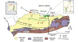 {{cite journal}}: Cite journal requires|journal=(help) - ^ Moore, T.E.; Wallace, W.K.; Bird, K.J.; Karl, S.M.; Mull, C.G.; Dillon, J.T. (1994). "Generalized geologic map and sections from Northern Alaska". The Geology of Alaska - Boulder, Colorado. Geological Society of America, The Geology of North America (editors: Plafker, G. and Berg, H.C.) (1994).