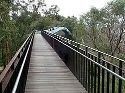 Since opening in 2003, the 52-metre (171 ft) elevated steel and glass bridge is one of Kings Park most notable tourist attractions. It is said that Mount Eliza performs a mediating role between the city and the bushland of Kings Park, and Federation Walkway is intended to allow visitors to appreciate this distinction and appreciate the heritage of the landscape.[18] Local Noongar artwork is incorporated in the design of the walkway with metal drawings into the bridge and a tiered performance area at the end of the walkway named Beedawong.[19]