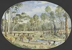 The Murdering Gully massacre occurred in a gully on Mount Emu Creek, where a small stream adjoins from Mérida station (near Camperdown) in early 1839. Between 35 and 40 men, women and children of the Tarnbeere gundidj clan were shot dead by Frederick Taylor and other shepherds for the killing of several sheep.[12][13]