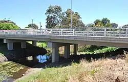 The Mount Emu Creek flowing under a bridge that carries the Glenelg Highway, near Skipton. | |