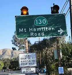 Cyclists commonly use the road because of the long but not overly challenging nature of the climb, sparse vehicular traffic over most of its length, and the views of San Jose and the Santa Clara Valley below. There is an annual cycling challenge climb in April.[18] Thanksgiving consistently draws hundreds of cyclists and is frequently the final climb in the annual Low-Key Hillclimb Series[19] which attracts some of the region's best climbers.