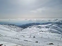 The relatively narrow Hermon range, with the Lebanon-Syria boundary along its spine, extends for 70 km (43 mi), from 25 km (16 mi) northeast of Mt. Hermon to 45 km (28 mi) southwest of it.[8] The Hermon range covers an area of about 700 km2 (270 sq mi) of which about 70 km2 (27 sq mi) are under Israeli control.[8] Mount Hermon is a cluster of mountains with three distinct summits, each about the same height.[8] Most of the portion of Mount Hermon within the Israeli-controlled area constitutes the Hermon nature reserve.[8][9]