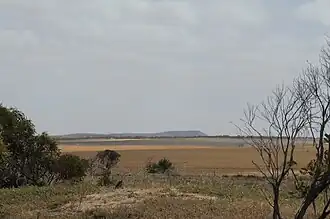 Mount Hill, showing its bluff northern face, as viewed looking in a westerly direction from Lincoln Highway near Port Neill, at a range of about 20 km.