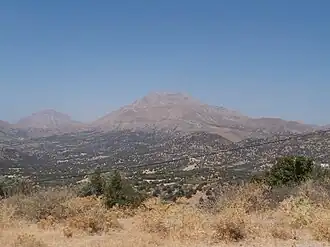 Mount Kedros (Greek: Όρος Κέντρος, also Κέδρος), is a mountain on the island of Crete in Greece. It is located southwest of the Ida massif with which it forms the two flanks of the Amari Valley. Mount Kedros is conical-shaped and made of limestone. Its landscape abounds with canyons and rock cliffs and is almost barren, with dry scrubs and phrygana being the major forms of vegetation. Kedros grows endemic or rare flowers such as tulips, anemones, corn marigolds, turban buttercups, tassel hyacinths, orchids, etc., and provides ideal conditions for the nesting of falcons as well as larger birds of prey such as griffon vultures, golden eagles and Bonelli's eagles.[3] Owing to the significance of its flora and fauna, Mount Kedros is a node of the Natura 2000 network of protected areas. An E4 mountain footpath climbs up to the highest peak of the site. To the north of Kedros are located the plateau Gious Kampos and the Kissano gorge.