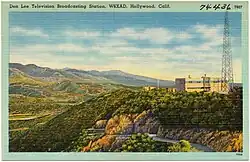 Four years later Lee began experimenting with television using call letters W6XAO.[3] Studios were on the seventh floor of a building at Seventh and Bixel near his Cadillac dealership. A few years later, the transmitter was moved atop what is now called Mount Lee. An early reference to this name is in a June 1939 article in a magazine published by the California Chamber of Commerce: "Lee has bought a 20-acre site on a mountain top at the eastern boundary of Griffith Park, widening the transmission field of the Don Lee equipment to take in new thousands of homes in the Hollywood hills and the San Fernando Valley. The site is one and a half times higher than the top floor of the Empire State Building in New York. Mount Lee is thus the highest television location in the world. The transmitter is being rebuilt for installation on the mountain."