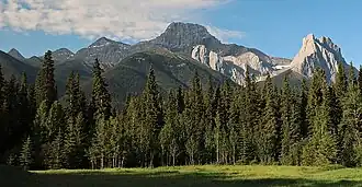 Mount Lougheed is a 3,107-metre (10,194-foot) triple-peak mountain located between Spray Lakes Reservoir and the Wind Valley of Kananaskis Country in the Canadian Rockies of Alberta, Canada. The highest summit is known as Peak 2 (3,107 metres). Peak 1 to the northwest is 3,080 metres.[4] Peak 3 to the southeast is 3,010 metres.[5] The nearest higher peak is Wind Mountain, 2.0 km (1.2 mi) to the southeast.[1] Mount Lougheed is a conspicuous landmark that can be seen from Highway 1, the Trans-Canada Highway at Dead Man's Flats which is east of Canmore.