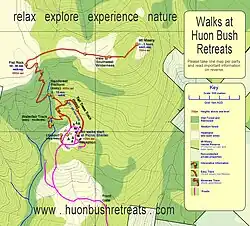 The car park and track head are at Huon Bush Retreats, Browns Road, Ranelagh.