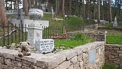 Deadwood was home to a sizable number of Chinese immigrants that settled in the area during the Black Hills gold rush, with an estimated 400 living in the city proper. The first recorded Chinese burial in Mount Moriah occurred on September 1, 1878.[7] Over the next fifty years, approximately 33 Chinese migrants would be buried in the cemetery.[8] However, because of the desire to be sent back to China, most of the bodies were disinterred. There are only three Chinese graves left in the cemetery, even though official signage lists two. The three tombstones read: "會大毓坟" (Grave of Hui Tian Fei), Wong Ngan Oi ("January 27, 1915, Age 15 yrs."), and a child of Fee Lee Wong (Born in Deadwood, SD. Died March 20, 1899").[9]