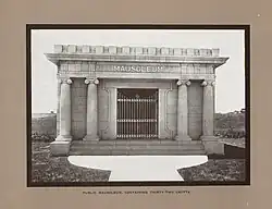 The cemetery was advertised daily in the Fort Worth Telegram newspaper throughout 1907 and 1908. In 1908, a new road connecting Fort Worth and then-suburb Riverside was built, making the cemetery far more accessible to local residents.[10] In 1909, a receiving vault with 32 crypts was constructed to facilitate burials and prevent grave-robbing. The $8,000 construction cost forced McPeak to default on loans, and he foreclosed in 1912. The directors of the Farmers and Mechanics Bank of Fort Worth paid off McPeak's debt and assumed ownership.[11][12] To further promote the cemetery and its parklike setting, the Mount Olivet Cemetery Association established bus service from downtown Fort Worth in 1914. The "auto passenger bus" ran six times a day between the cemetery and the Flatiron Building.[13] Local businessman William J. Bailey acquired Mount Olivet in 1917, and his son, John, became its general manager in 1945. In 1956, the Baileys converted the Mount Olivet company into a nonprofit organization. The original cemetery's articles of incorporation stating that "no negro or person of African descent shall ever be interred on said lots" were found to be illegal and were amended in 1969. Though it had been restored in the 1940s, the receiving vault was determined to be beyond repair and demolished in 1983.[2]