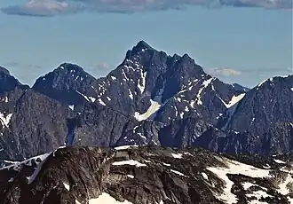 Mount Payne is a 2,468-metre (8,097-foot) mountain summit located in the Canadian Cascades of southwestern British Columbia, Canada. It is situated 27 km (17 mi) southeast of Hope, 14 km (9 mi) northeast of Chilliwack Lake, and 4 km (2 mi) west of Silvertip Mountain, which is its nearest higher peak. Following Silvertip, Mount Payne is the second-highest summit in the Hope Mountains, a subset of the Skagit Range.[3] The peak was first climbed in 1950 by J. Bussell, H. Genschorek, I. Kay, A. Melville, and W. Sparling.[1] The peak was named for Damasus Payne, a Benedictine monk and mountaineer who fell to his death on Edge Peak in 1978.[1] Payne was responsible for naming mountains such as Mount Rohr and Mount Duke. He also carried all the materials for mass and communion up to the summit of Slesse Mountain to perform a ceremony to honor the victims of Trans-Canada Air Lines Flight 810.[1] Mt. Payne's name was officially adopted May 7, 1984, by the Geographical Names Board of Canada.[4] Precipitation runoff from the peak drains into headwaters of the Sumallo River, and into the Klesilkwa River, which is a tributary of the Skagit .