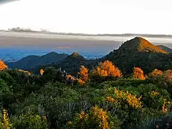 Mount Pirongia is an extinctstratovolcano located in the Waikato region of New Zealand's North Island. It rises to 959 m (3,146 ft) and is the highest peak around the Waikato plains. Pirongia's many peaks are basaltic cones created by successive volcanic eruptions between the late Pliocene and early Pleistocene, about 2.5 million years ago.[4] In the adjacent picture, the characteristic profile of the mountain can be seen, along with a prominent accessory cone to the right (on the northern flank).