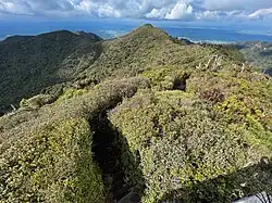 Mount Pirongia is the largest stratovolcano in the Alexandra Volcanic Group chain which extends inland from Mount Karioi near Raglan. It is a mainly basaltic volcano, though andesite dykes form the peaks of Wharauroa, Mahaukura, Tirohanga, Pirongia Summit and The Cone. To the west it merges into the highland terrain of the Karioi horst block and in the east it arises above the Hamilton Basin, a major rift-related depression bound by the Waipa Fault Zone.[2] There are at least six edifice-forming members separated by features including those resulting from large volume collapse events.[3] The largest debris avalanche (the Oparau breccia) cascaded at least 25 km southwest from Pirongia into the Kawhia Harbour and was larger in volume (3.3 km3) than the Mt. St. Helens collapse of 1980 (2.5 km3).[9] The collapse was followed by late-stage eruptions from the summit area around 1.6 Ma. The mountain contains unusually crystal-rich lavas of (ankaramite basalt) that also occur on Karioi, Kakepuku and Te Kawa but are not found elsewhere in New Zealand.[1]