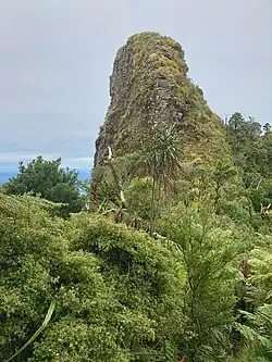 Mount Pirongia viewed from a distance (approx Feb 2013); the profile is clearly shown as is the secondary cone to the right of the mountain.The Tirohanga Track skirts the foot of the hornblende andesite dike