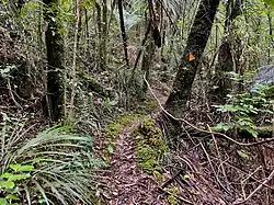 Hihikiwi Track (4–6 hr / 6.4 km (4.0 mi) km one way) climbs many steps in bush from Pirongia West Road, then rises further to an up and down ridge, to reach Hihikiwi Lookout (905 m (2,969 ft)), where there are views down the Ōpārau valley to Kawhia Harbour. From the lookout there is a boardwalk and steps down and up to the hut.[25][26]
