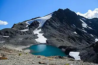 The Olympic Mountains are composed of obducted clastic wedge material and oceanic crust, primarily Eocene sandstone, turbidite, and basaltic oceanic crust.[8] The mountains were sculpted during the Pleistocene era by erosion and glaciers advancing and retreating multiple times.