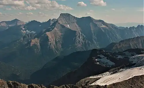Mount Stimson (10,147 feet (3,093 m)) is the second highest peak in Glacier National Park, located in Montana, United States. It is part of the Lewis Range, which spans much of the park.[3] It is located in the remote southwestern portion of the park, approximately 5 miles (8.0 km) west of the Continental Divide and 12 miles (19 km) southeast of Lake McDonald. It is drained by Pinchot Creek (on the south) and Nyack Creek (on the other sides), both of which flow into the Middle Fork of the Flathead River. The mountain is named for Henry L. Stimson (1867–1950), former U.S. Secretary of State and twice Secretary of War, who hiked and assisted George Bird Grinnell survey the area in and around Glacier National Park in the 1890s, and supported efforts to establish the national park.