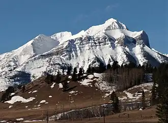 Mount Tecumseh is an iconic landmark situated 10 kilometres (6.2 mi) west of the town of Coleman in the Crowsnest Pass area and can be seen from Highway 3, the Crowsnest Highway.[4] The mountain anchors the southern end of the High Rock Range and precipitation runoff from the mountain drains into tributaries of the nearby Crowsnest River. Topographic relief is significant as the summit rises nearly 1,200 metres (3,900 ft) above Crowsnest Lake in three kilometres (1.9 mi). The summit of Mt. Tecumseh lies one kilometre (0.62 mi) east of the Continental Divide, and the mountain's slightly lower peak, named Phillipps Peak (2,506 metres [8,222 ft]), lies directly on the divide above both Crowsnest Pass and Phillipps Pass. The nearest higher neighbor is Crowsnest Mountain, 6.74 kilometres (4.19 mi) to the northeast.[2]
