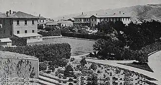 The Mount View Lunatic Asylum (alternates: Mt. View Lunatic Asylum, Mount View Asylum) was a psychiatric hospital located on 113 acres (46 ha) near the Basin Reserve in Wellington, New Zealand. Government House is now located on what were the asylum grounds.[1] Work began in 1872, and the hospital opened in May 1873.[2] It replaced Karori Lunatic Asylum, the first asylum in the country.[3] Mount View was planned to accommodate 28 male and 28 female patients, but as 70 patients were transferred from Karori, overcrowding was a problem from the beginning.[4] An expansion was required soon after the asylum opened to accommodate more patients, so in 1879 the two-storey wooden structure was enlarged with a block for 50 male patients, and another wing was built during 1880.[5][6] Around 1885 two additional wards were constructed.[7] By 1905 there were 250 patients but within the next five years, they were transferred to Porirua Lunatic Asylum and other asylums, before Mount View's closure in 1910.[8][4]