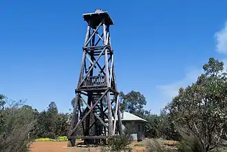 Mount Wells's history since colonisation, as the highest point in the area, was as a fire lookout for the surrounding timber milling region. The original fire tower and huts were ironically destroyed by fire in 1961, but rebuilt in 1962. It was renovated by the Department of Conservation and Land Management (CALM) and a Karnet Prison crew in 1997 for overnight use by walkers on the 'new' Bibbulmun Track, Western Australia's award-winning walk trail, stretching nearly 1,000 kilometres from the Perth Hills to Albany.[3]