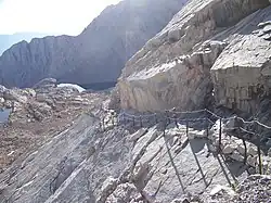 The Mount Whitney Trail is a hiking trail that climbs Mount Whitney, the tallest peak in the contiguous United States. It starts at Whitney Portal, 13 miles (21 km) west of the town of Lone Pine, California. The hike is 21.4 mi (34.4 km) round trip, with an elevation gain of over 6,100 feet (1,860 m). It is a very popular trail during Summer and Fall when ice and snow are not present, and therefore its access is restricted by quotas from May to October.[2] Access during non-peak months require permits from the United States National Forest, but quotas are not necessary.[3]