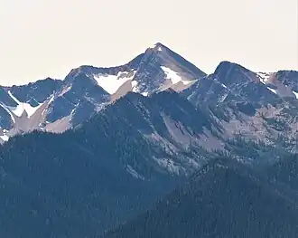 Mount Winthrop is a prominent 7,850-foot (2,393-metre) mountain summit located in Okanogan County of Washington state. The mountain is part of the Hozameen Range of the North Cascades and is situated 2 miles (3.2 km) south of the Canada–United States border within the Pasayten Wilderness, on land managed by the Okanogan–Wenatchee National Forest. The nearest higher peak is Frosty Mountain, 4.6 miles (7.4 km) to the northwest.[2] Precipitation runoff from the mountain drains into tributaries of the Similkameen River. Like many North Cascades peaks, Mount Winthrop is more notable for its steep rise above local terrain than for its absolute elevation. Topographic relief is significant as the west aspect rises 2,850 feet (870 m) above Route Creek in 1.0 mile (1.6 km). The Pacific Northwest Trail traverses the southeast slope of the mountain and the Pacific Crest Trail traverses the western base of the mountain.
