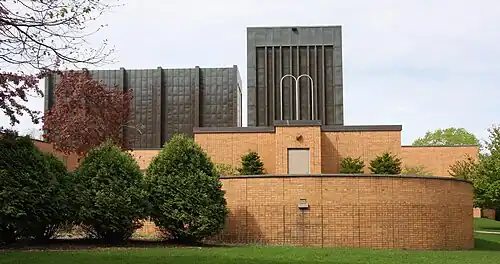 In the 1950s, the congregation chose the prominent avant-garde architect Erich Mendelsohn to design a building for them. After projects in Europe, the Soviet Union, Israel and America – this was his final building, breaking ground in 1952 and completed after his death in 1953.[11][1] Completed in late 1954, the farewell service in the old temple building at Avon St & Holly Ave took place on Friday, December 17, 1954, with dedication of the new building on Sunday, December 19, 1954, installing the Torah scrolls and lighting an "eternal light" on the altar of the main sanctuary—intended to burn continuously; Rabbi Gunther Plaut stated it was the first such continuously burning light in the United States.[12] It is located on Summit Avenue.