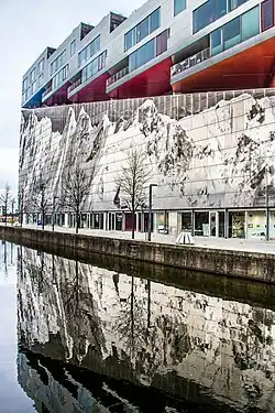 The northern and western facades of the parking garage depict a 3,000 m2 photorealistic mural of Himalayan peaks. The parking garage is protected from wind and rain by huge shiny aluminium plates, perforated to let in light and allow for natural ventilation. By controlling the size of the holes, the sheeting was transformed into the giant rasterized image of Mount Everest. The picture is based on a photo commissioned from a Japanese Himalaya photographer, though it had to be stretched to fit the proportions of the site.[3]