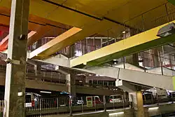 The parking garage contains parking spots for 480 cars. The space has up to 16 m high ceilings, and the underside of each level of apartments is covered in aluminum painted in a distinctive colour scheme of psychedelic hues which, as a tribute to Danish 1960s and '70s furniture designer Verner Panton, are all exact matches of the colours he used in his designs. The colours move, symbolically, from green for the earth over yellow, orange, dark orange, hot pink, purple to bright blue for the sky.[2] Besides being a sloping podium for the residential units to sit on, maximizing sunlight and views, the central garage space also serves as an atrium containing the building's circulation, affording the only access to the apartments. A set of metal stairs climb through the main space over the parking lot, providing access to the hallways across suspended industrial-looking metal-clad concrete connections, while a Swiss-manufactured, ski lift-style inclined elevator moves along the wall of the garage. Each level's hallway is enclosed and encased in painted metal both on the interior and exterior, colored according to floor in the same hues used in the main space.