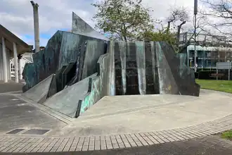 Mountain Fountain took a year to build[6] and was unveiled by Mayor Colin Kay in April 1981[7] with the title The Aotea Square Water Feature.[8] Stringer called the work "Mountain Fountain"[9] and by the time of its re-siting in 2010 this had become its official name.[10] The sculpture is a Cubist landscape made of 1.5 tonnes of bronze sheets fastened to a concrete and plywood framework.[3] It measures 5 metres (16 ft) tall, 7.7 metres (25 ft) long and 6.3 metres (21 ft) wide.[11] It depicts a volcano erupting through the earth, alluding to the volcanic field upon which Auckland is built. Stringer envisioned the sculpture as bringing a piece of the wild nature of New Zealand's landscape into the city.[3] Streams of water added to the sense of movement.[10]